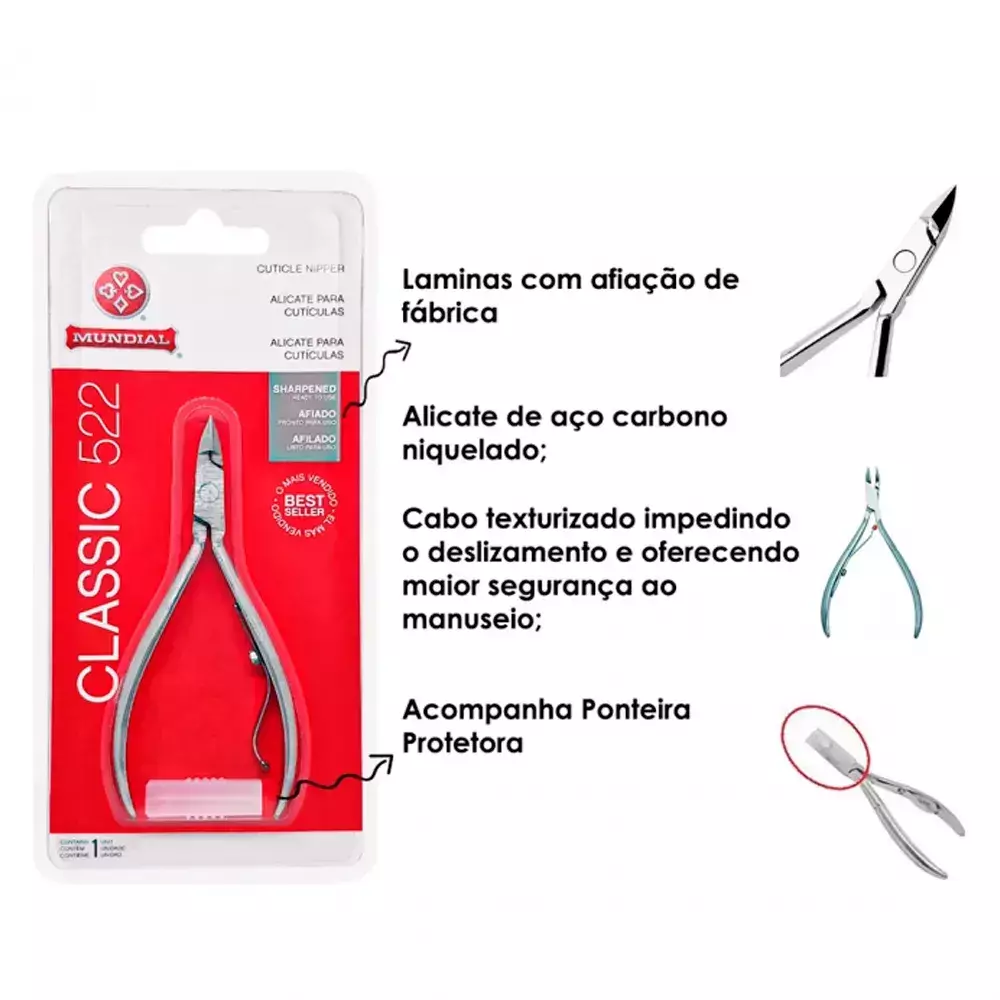 O Alicate Profissional 522 Classic Mundial é a escolha ideal para manicures e pedicures que buscam qualidade, resistência e cortes precisos. Produzido em aço carbono niquelado, possui lâminas afiadas manualmente, garantindo um corte limpo e sem esforço em cutículas, com segurança e praticidade em cada atendimento. Seu design anatômico e sistema de mola facilitam o uso, proporcionando maior conforto ao profissional durante o manuseio. Com o Alicate 522 Classic Mundial, você valoriza o seu trabalho com um instrumento de confiança e excelente custo-benefício, mantendo seu kit de atendimento sempre pronto para entregar resultados impecáveis às suas clientes.